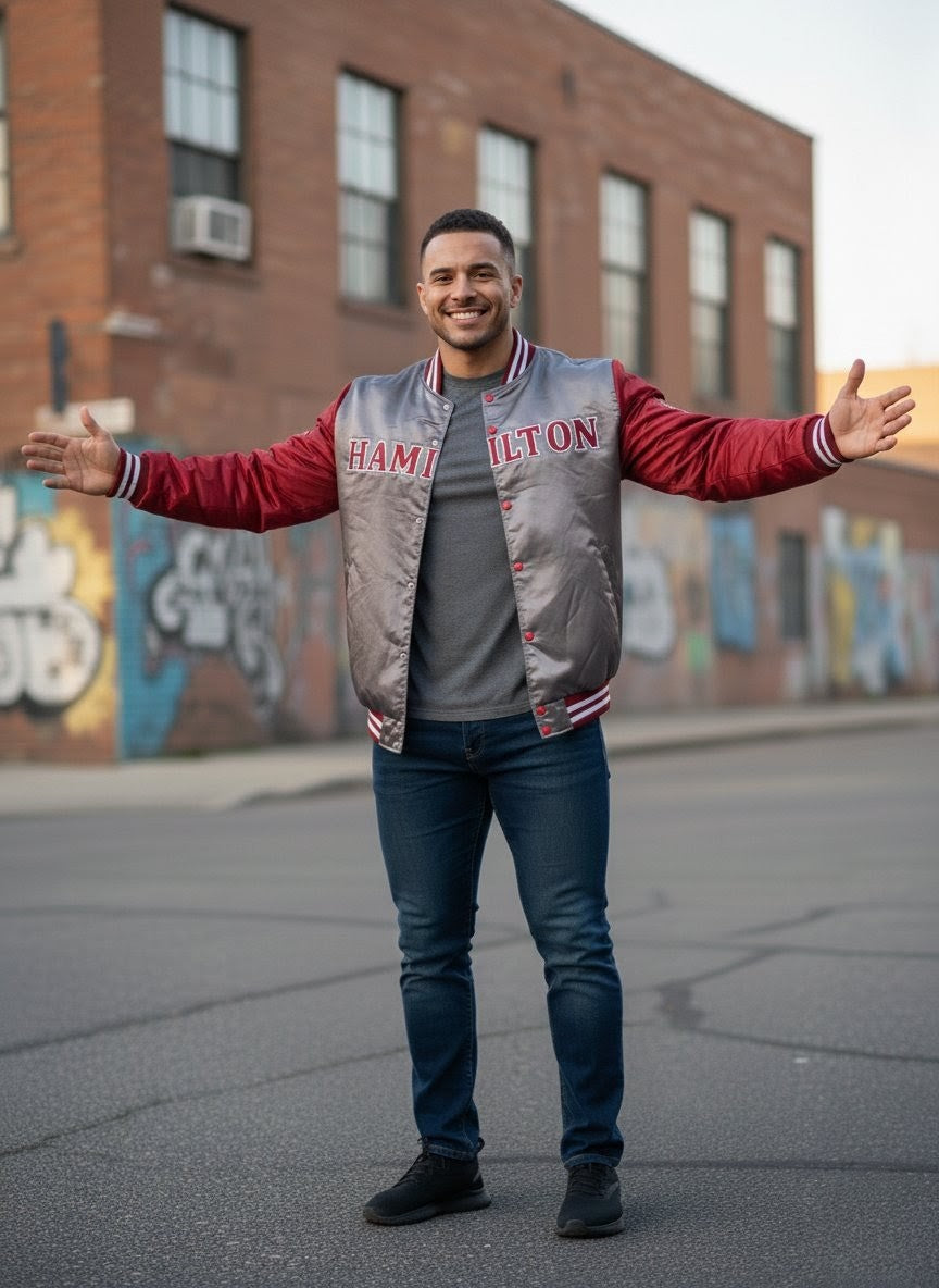 The Hamilton Bomber Jacket combines classic athletic style with versatile two-tone design. Featuring contrasting gray and maroon colorways, this jacket delivers school spirit with contemporary appeal. The bomber silhouette offers a relaxed yet polished fit, making it ideal for game days, casual outings, or layering during cooler months. Quality construction ensures durability through repeated wear, while the color combination pairs effortlessly with most wardrobes. Perfect for fans and alumni who want to represent their school with understated confidence.